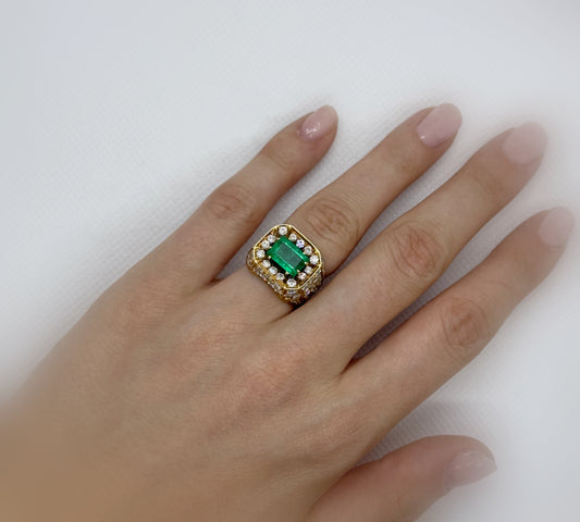 Anello a trombino anni '60 oro giallo con smeraldo e diamanti
